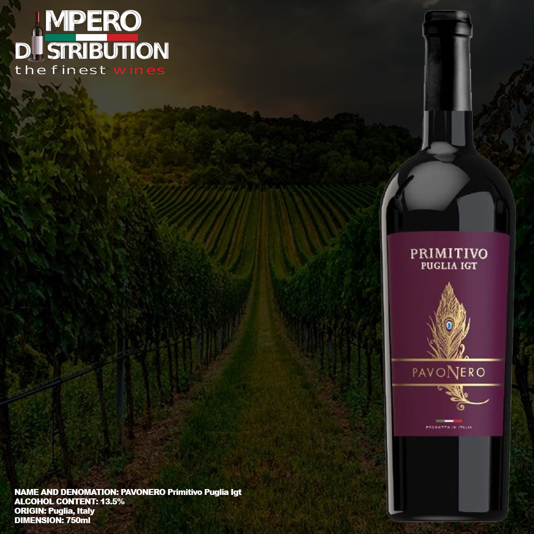 PAVONERO Primitivo Puglia IGT is a rich and expressive red wine from southern Italy, crafted from hand-selected Primitivo grapes. It offers intense notes of ripe berries, dark cherries, and a touch of spice, balanced by smooth tannins and a full-bodied finish. A perfect companion to grilled meats, hearty pastas, or aged cheeses.